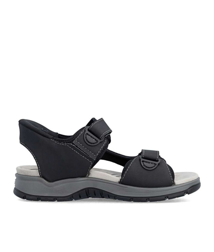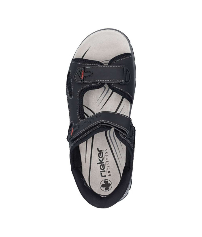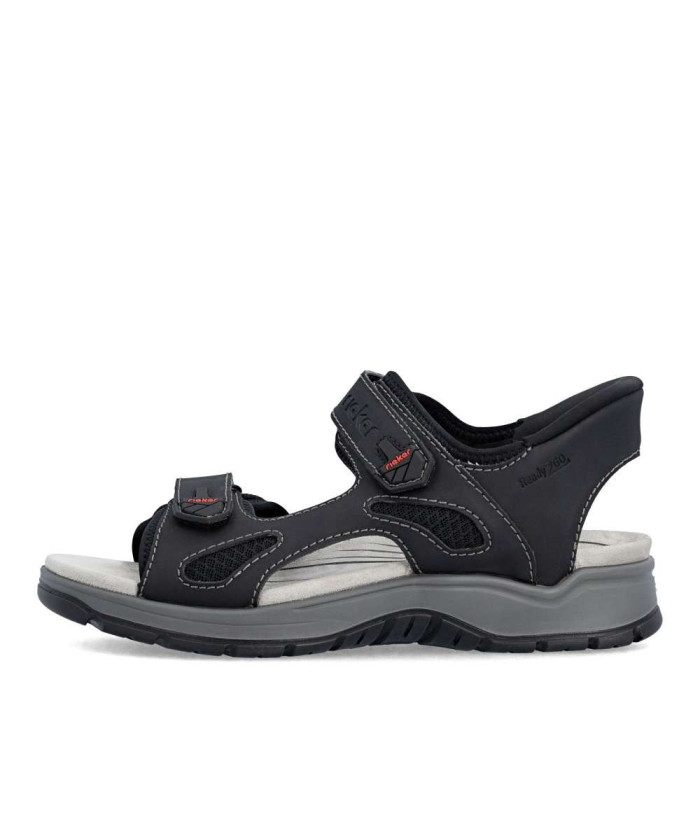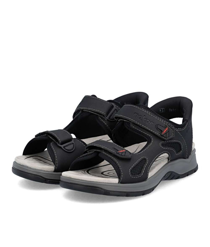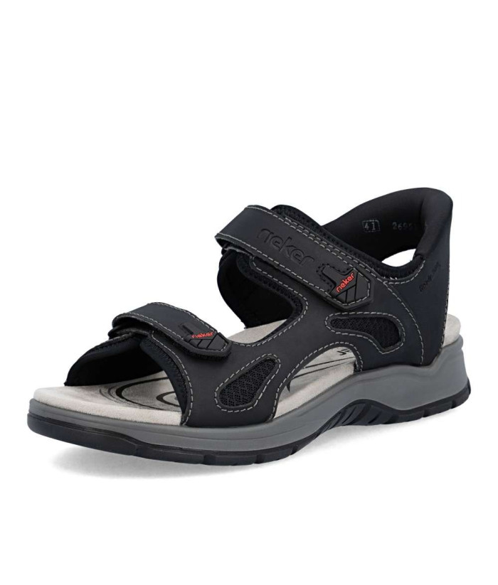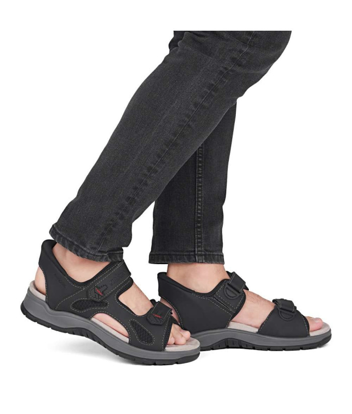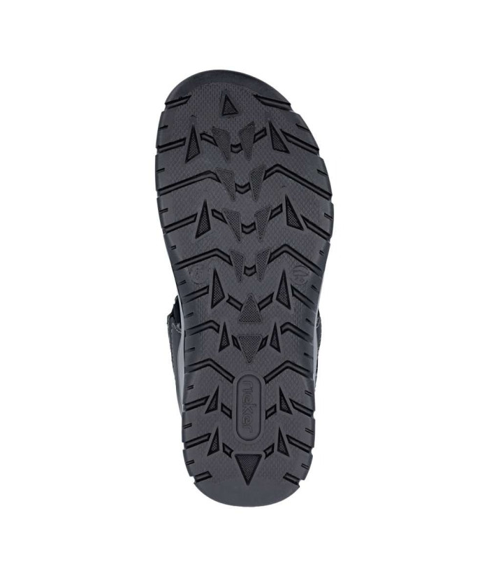 La teinte noire de la matière lisse, associée à des éléments textiles foncés, crée un ensemble visuellement attrayant et indémodable, facile à assortir à toutes vos tenues estivales. Les logos RIEKER, judicieusement placés, confèrent aux sandales un caractère prestigieux et soulignent leur qualité. Pratiques, elles sont dotées de deux brides Velcro réglables et d'un contrefort stable pour un enfilage et un retrait faciles, ainsi que d'un ajustement précis à la forme du pied. La semelle intérieure textile confortable offre une sensation agréable à chaque pas, tandis que la semelle extérieure flexible et amortissante protège les articulations et assure une démarche fluide et naturelle. Ces sandales sont idéales pour une utilisation quotidienne en ville, mais aussi pour les loisirs, les voyages ou les vacances.