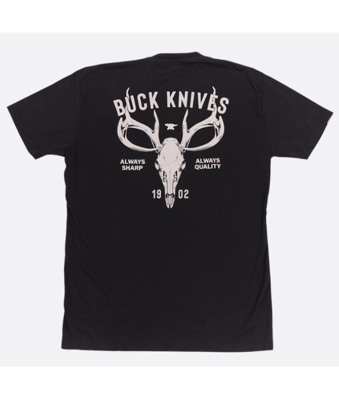 60 % coton, 40 % polyester. T-shirt noir avec logo Buck sur la poitrine gauche et illustration de crâne de cerf au dos. Tailles disponibles : du S au 4XL. Coupe ajustée ; pour une coupe plus ample, choisissez une taille au-dessus. Laver à froid avec des couleurs similaires, sécher en machine à basse température, ne pas repasser, ne pas nettoyer à sec, repasser à basse température. Importé.